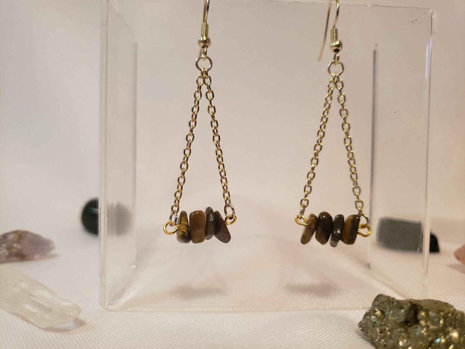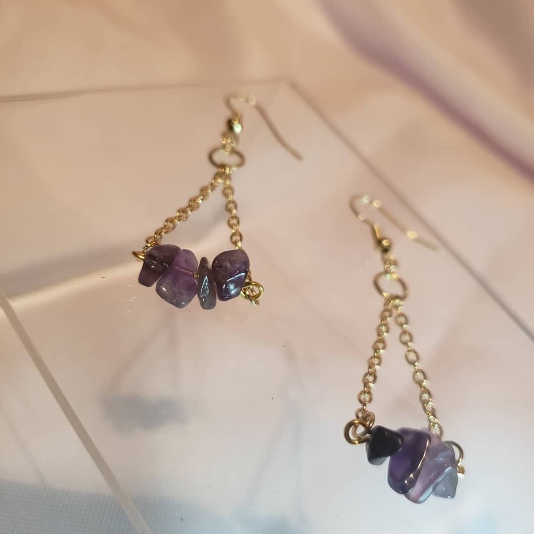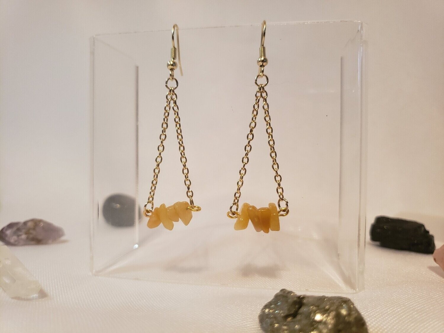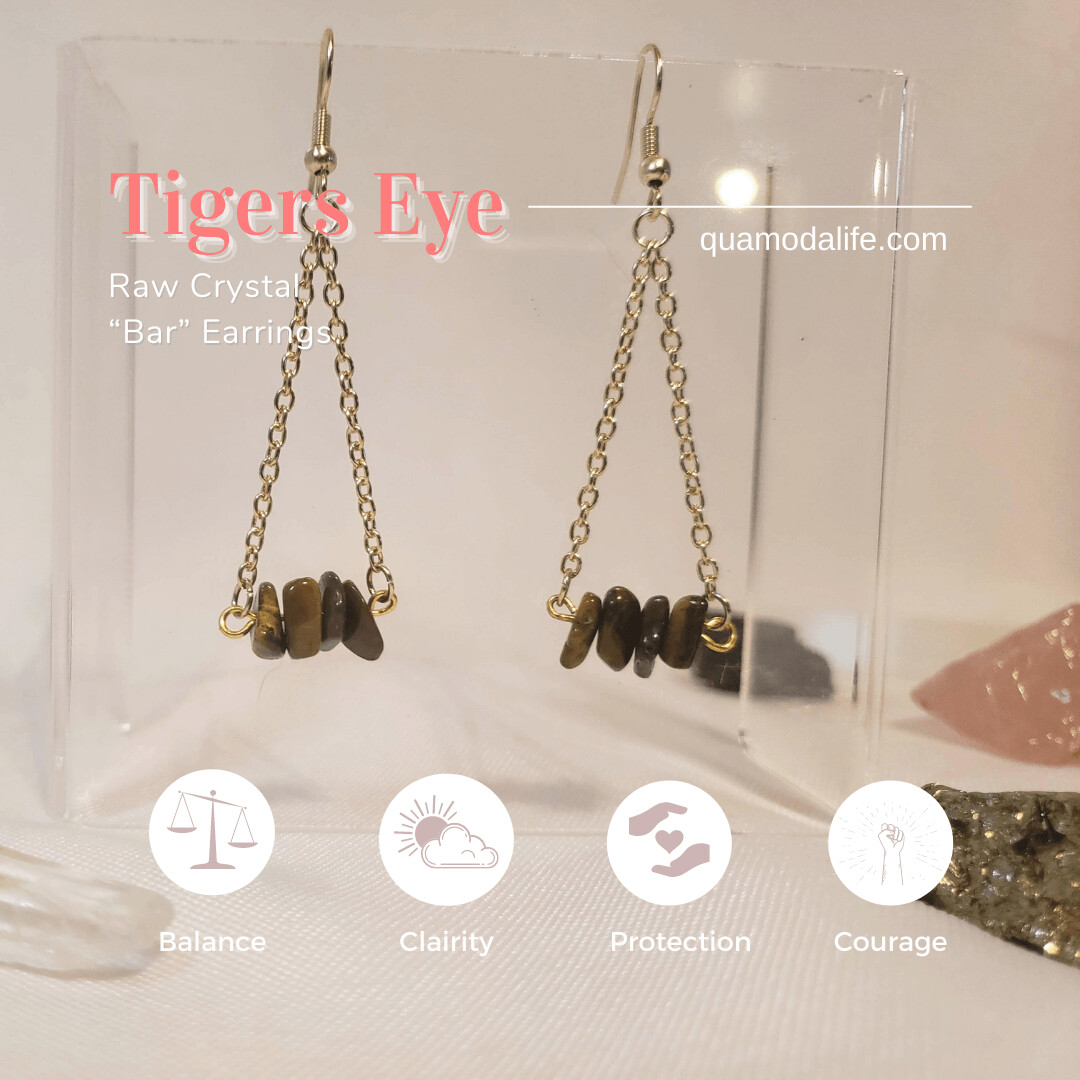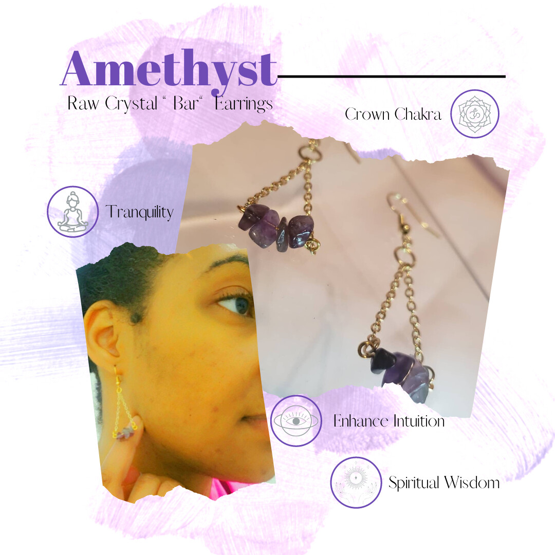 Small and discreet, these light weight dangle earrings can help you channel the energies you desire with your choice of raw stone set on a gold plated bar.